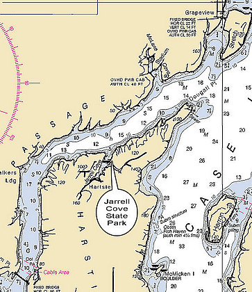 Jarrell Cove is located on Harstine Island on Pickering Passage. The entrance to the cove is at